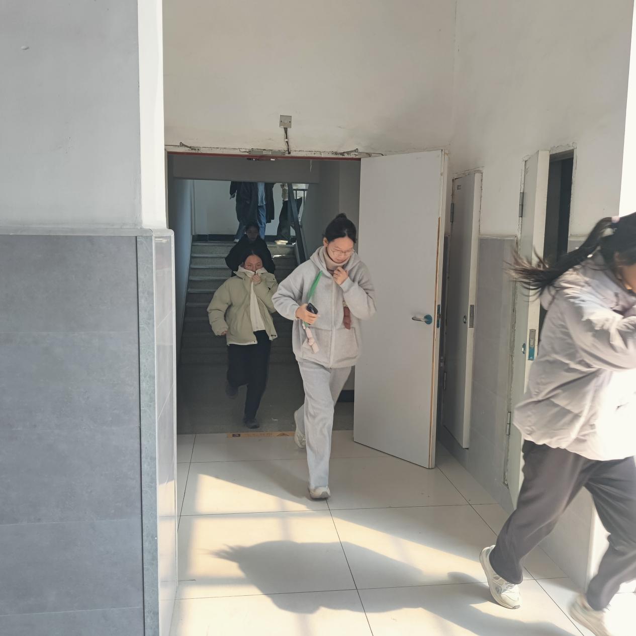 随着火灾报警系统响起,各应急小组人员分工合作,组织师生迅速疏散撤离。在疏散人员的引导下,全体师生按照预定的疏散路线,俯身弯腰,捂住口鼻,低姿通过安全出口,安全、高效、有序的撤离,几分钟后学院楼内师生已全部撤离到达室外指定集合地点。