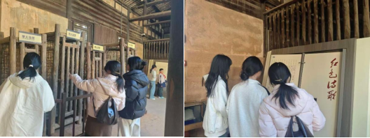在刑具陈列区,“单人站笼”、“双人站笼”等实物无声的诉说着曾经的残酷岁月,让同学们深刻体会到革命斗争的艰苦卓绝,认识到新时代幸福生活的来之不易。而一旁的“红色诗歌”展陈,则如一团不灭的火焰,闪耀着革命者在黑暗中仍怀有的坚定信念与乐观精神,引发同学们对信仰与责任的深入思考。