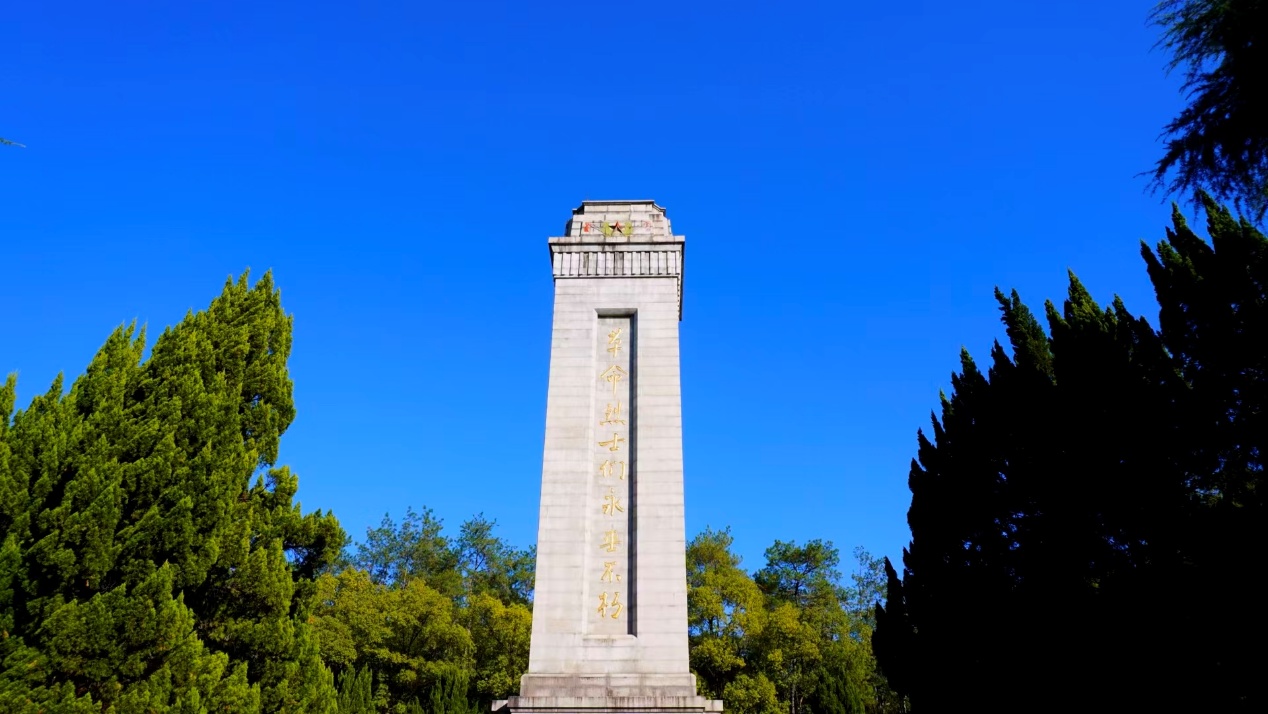 进入景区,映入眼帘的是一座革命烈士纪念碑,阳光透过苍松翠柏,洒在庄严的纪念碑上,彰显出革命岁月的悲壮和沉重,同学们纷纷在纪念碑前肃立瞻仰。